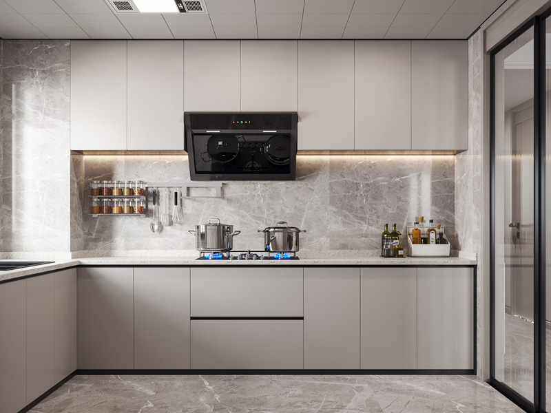 一字型厨房的设计通常将灶台、操作区等都安排在同一水平线上,保证留有充分的活动空间,使较小的厨房中,避免过多橱柜拥挤影响行动。