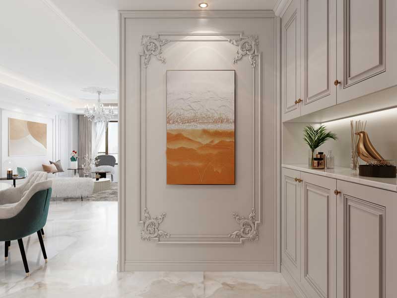 玄关区域采用隔断+收纳柜设计,满足生活的私密性,更加具有安全感,色彩上增添橙色,提升活力。